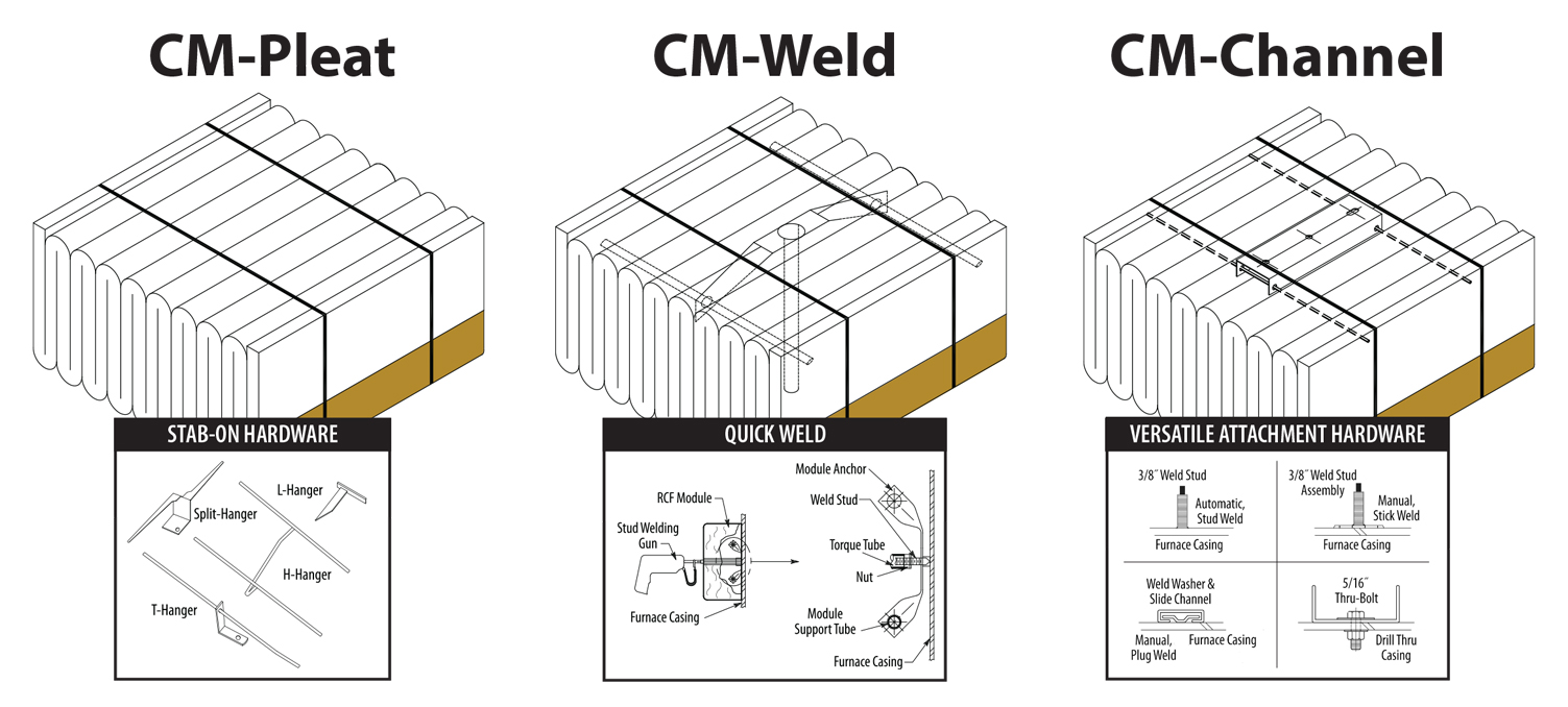 陶瓷纖維模塊可以通過幾種不同的連接方式輕松地固定在各種熱處理設備的內部鋼殼上。用來連接的錨固件預埋在模塊內部,不必接受火焰的沖刷和爐膛氣氛的腐蝕,有效延長陶瓷纖維模塊的使用壽命。